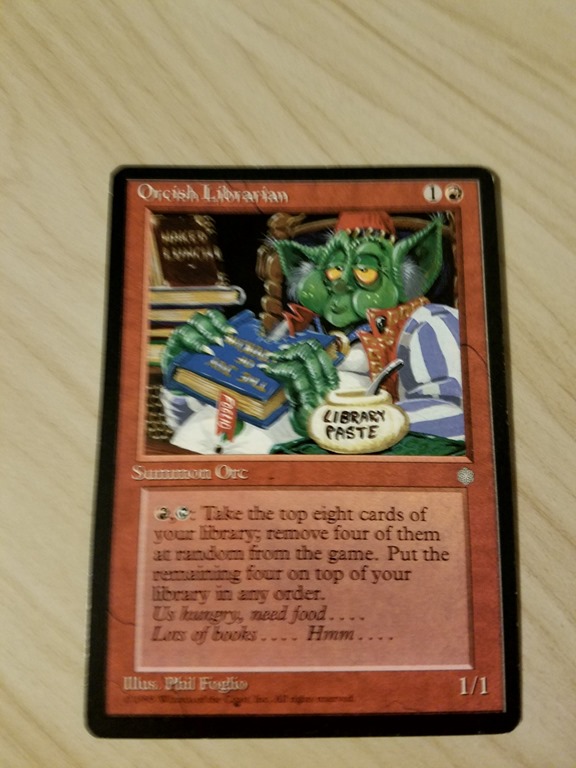I love this card so much. I have a ridiculous deck where I run this card. This card can obliterate your own deck if you’re not careful, which makes the artwork on it so great! When I realized my character/creature mistake, I immediately suggested I could use this card now. We both laughed, thinking about the picture and commenting on the “Library Paste”!